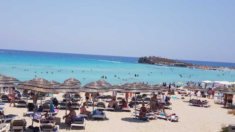 Staden är en populär badort under hela året och det är oftast 17 grader i vattnet under vintern. Ayia Napa har långgrunda, finkorniga sandstränder. Det finns tolv stränder som har Blue Flag, de två längsta och populäraste är Grecian Bay och Nissi Beach. Parasoll och solstol finns att hyra på stränderna för ca 50:-/dag, fram till slutet av november. Den lilla sandstranden Sandy Bay Beach ligger tre kilometer väster om centrum. Den är bra att fly till om det blåser för mycket vid Grecian Bay eller Nissi eftersom den ligger i en vindskyddad vik. Några kilometer utanför staden ligger även den populära vattenparken Waterworld.